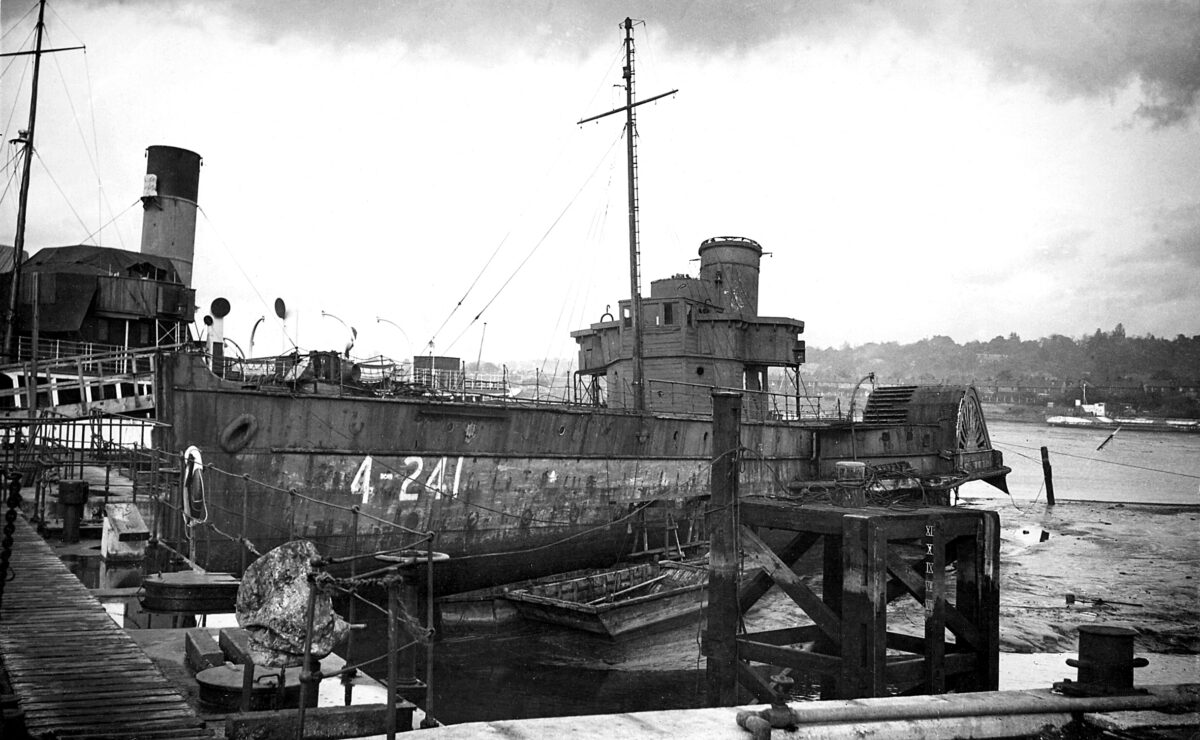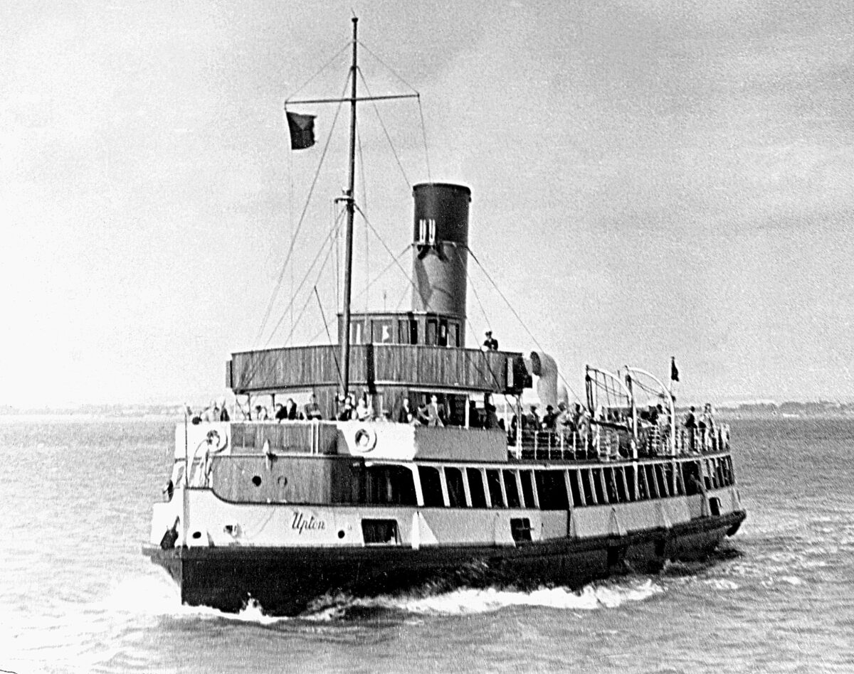 Upton on the left with her bridge covered in a tarpaulin with PS Balmoral in the foreground in rather less than poor condition after her war service. She would not sail again. Upton arrived in Southampton for upgrading around VE Day in May 1945 and was ready for service running between Southampton and Ryde by September 1945.